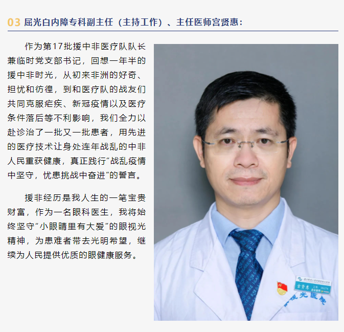 他們紛紛表示將銘記總書記諄諄教誨,踐行人民領(lǐng)袖殷殷囑托,大力弘揚(yáng)不畏艱苦、甘于奉獻(xiàn)、救死扶傷、大愛(ài)無(wú)疆的中國(guó)醫(yī)療隊(duì)精神,以更優(yōu)質(zhì)的醫(yī)療服務(wù),為推動(dòng)援中非醫(yī)療事業(yè)實(shí)現(xiàn)高質(zhì)量發(fā)展和人民群眾眼健康奉獻(xiàn)自己的光和熱。